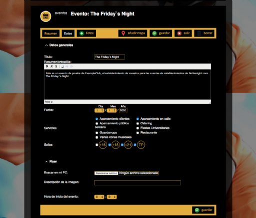 El sistema de Bethenight no usa la hora para organizar los eventos en las búsquedas, sólo organiza las fechas, por lo que por ejemplo si un evento el viernes por la noche tiene una hora de inicio a las 01:30h /1:30am (ya del sábado), para la correcta visualización en las búsquedas y las páginas y no crear confusiones, en necesario poner el evento con la fecha del viernes. En el caso de la hora de inicio del evento, esta no tiene relación con las búsquedas, por la que puede poner la hora en la que empiece el evento sin crear conflictos en las fechas.