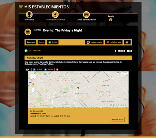 Para modificar los datos de un evento existente o ya publicado, acceda al Resumen de Mis Establecimientos, y en la lista de Eventos en curso, en la columna derecha, busque el evento que quiera modificar: